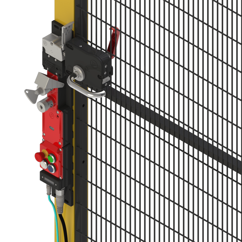 All’interno del corridoio, un interruttore interno a chiave per la selezione della modalità consente il funzionamento manuale della gru. Al termine del lavoro, l’operatore riporta il dispositivo di selezione della modalità in modalità automatica, rimuove la chiave ed esce dal corridoio. L’interblocco ha anche una funzione di sblocco di fuga nel caso in cui il personale rimanga intrappolato.
