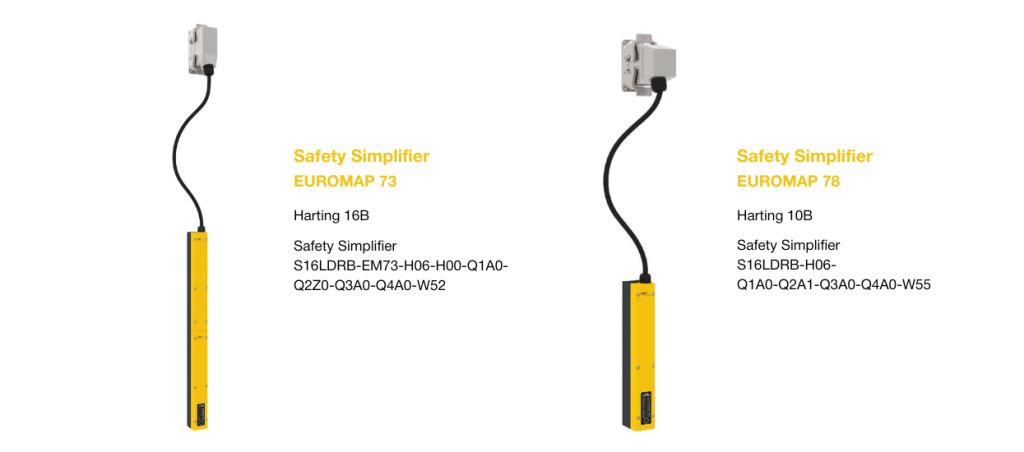 Il Safety Simplifier integra le interfacce EUROMAP 73 e EUROMAP 78, che sono standard tra i produttori di macchine per stampaggio a iniezione. EUROMAP 73 richiede contatti NO e NC dai dispositivi di sicurezza, mentre EUROMAP 78 utilizza segnali OSSD (Output Switching Signal Device) intrinsecamente sicuri. Questa standardizzazione facilita l’integrazione e migliora la coerenza e l’affidabilità dei sistemi di sicurezza.